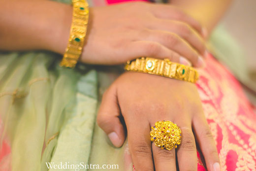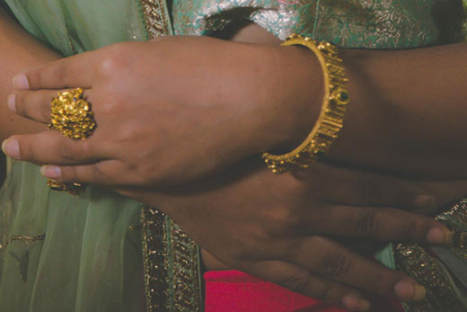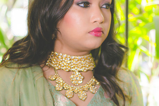 Enchantingly brilliant from head to toe, Aditi was a vision in pastel brocades made even more gorgeous with Azvapolki diamond studded jewellery. Modern , stacked necklace created a statement that was hard to miss. Tousled curls framed the face blush with bridal glory. A polki cocktail ring completed this sophisticated new age bridal look with a heavy glamour quotient.