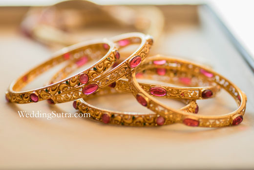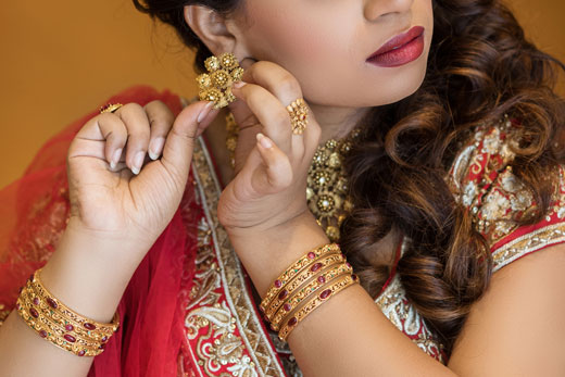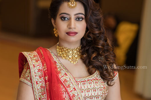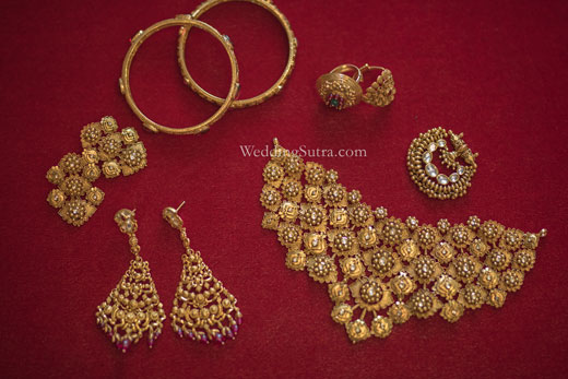 Alongside all the polki brilliance was a handcrafted choker of sculptural blooms showcased on bride to be, Meghna. Her orange lehenga and yesteryear, swept aside curls complimented the 22karat gold masterpiece. Replete with a stack of chased bangles, studded with coloured stones and granules of gold on a dainty maangtika, the look was all about embracing the glamour in all its bridal glory.