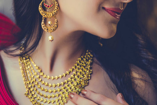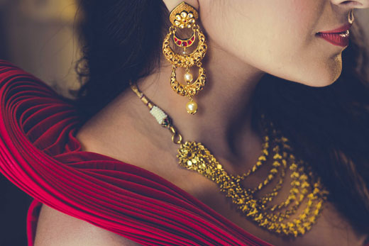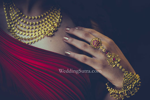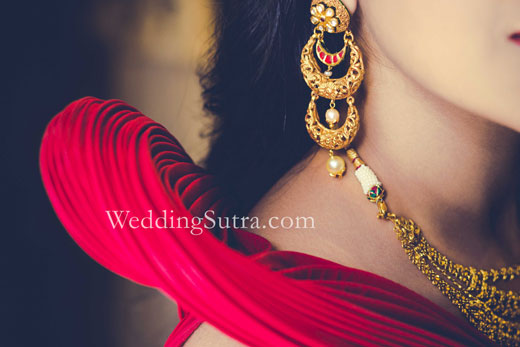 The time has come to change things up and look towards contemporary options for the bride of today. WeddingSutra styled bride to be, Payal with a dash of vivid red but with an edgy twist, pairing Azva gold jewellery with Gaurav Gupta couture. The waves of the gown formed the perfect backdrop for handcrafted gold stacked chandbalis paired with a dainty seven rows haar. A gold haathphool is the perfect addition to this modern take on bridal, replete with clusters of tiny gold beads. Tousled locks and fresh face finished off the look, transforming Payal to be as gorgeous as ever.