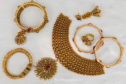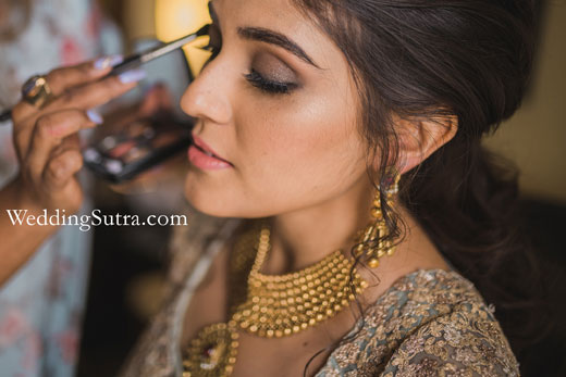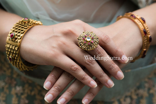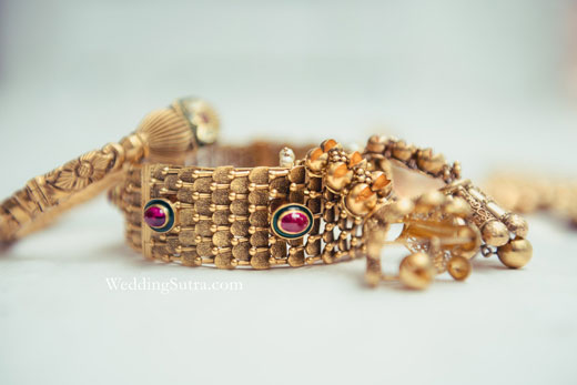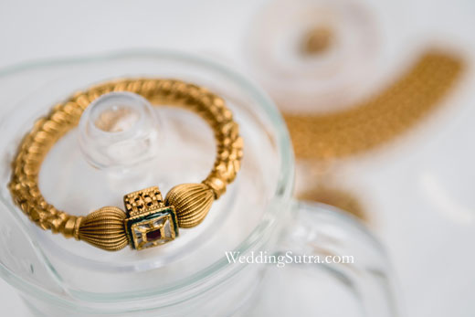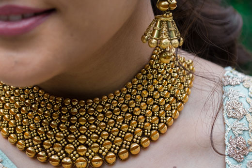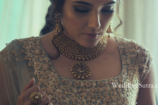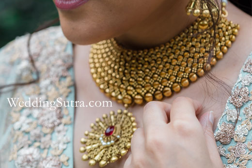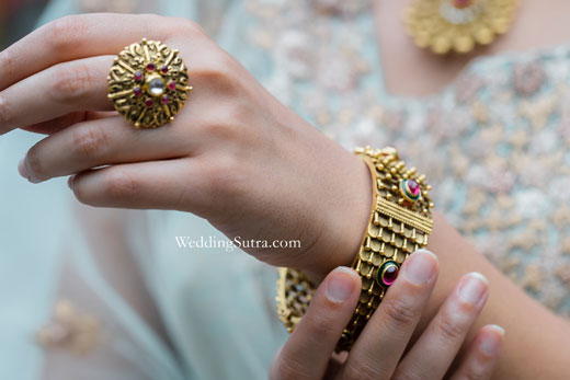 A pastel palette of colours made the perfect pairing as WeddingSutra decked up their bride to be, Snehal Gupta in contemporary pieces by Azva. The gold choker of handcrafted ghungroos and beads embraced the bride with a statement pendant to covet. The look was kept sultry with smoky eyes and blush lips to complement this Sangeet ready pairing. Gold jhumkis with handcrafted beads, a cocktail ring and artisanal bangles and cuffs finished up the look, setting major bridal style goals.