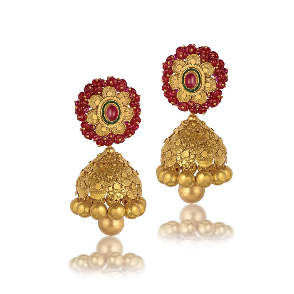 Scallops of diverse textures dangle form a stud of seven gold petals surrounded by colourful beads as these modern jhumkis embody the sevn vows, finished with a row of gold balls and a dangle in satin finish.