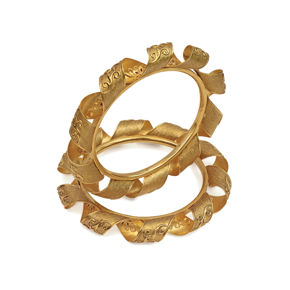 Swirling sheets of gold wrap around the wrist with intricate scrolls as these contemporary gold bangles create a moment of handcrafted splendour with twists and folds of embossed relief work.